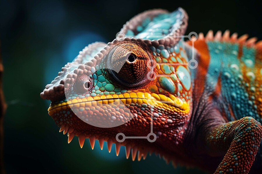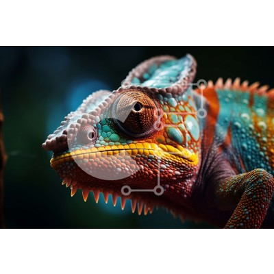 Υπάρχει δυνατότητα προσωποποίησης με δική σας φωτογραφία και προσαρμογής διαστάσεων κατόπιν παραγγελίας. Το συγεκεριμενο puzzle παρουσιαζει Αυτή η εικόνα παρουσιάζει έναν πολύχρωμο χαμαιλέοντα με έντονα μπλε, πράσινα και κίτρινα χρώματα στο σώμα του. Τα μεγάλα μάτια του χαμαιλέοντα και η μακριά, κολλώδης γλώσσα του φαίνονται με λεπτομέρεια. Το σώμα του καλύπτεται από μικρά, ανώμαλα λέπια που το βοηθούν να εναρμονι