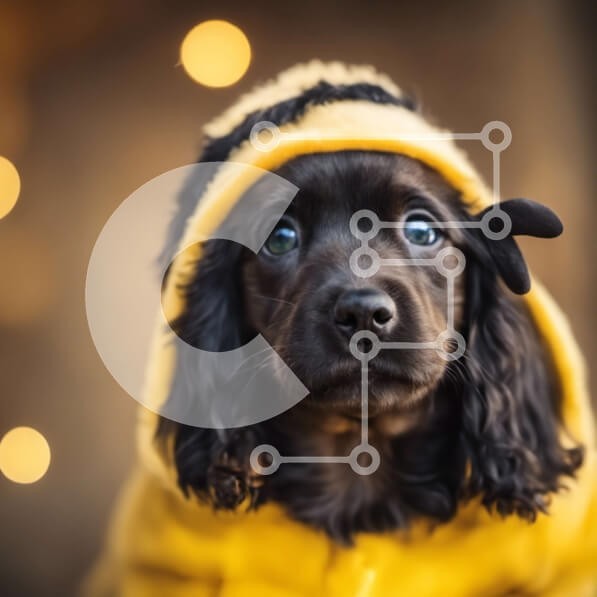 Υπάρχει δυνατότητα προσωποποίησης με δική σας φωτογραφία και προσαρμογής διαστάσεων κατόπιν παραγγελίας. Το συγεκεριμενο Puzzle 10x10 cm – 25 κομμ παρουσιαζει Αυτή η εικόνα δείχνει έναν αξιολάτρευτο μαύρο και καφέ σκύλο που φοράει μια κίτρινη στολή μέλισσας. Ο σκύλος κοιτάζει κατευθείαν την κάμερα με ορθάνοιχτα μάτια, αποπνέοντας ενθουσιασμό και περιέργεια. Τα φώτα που περιβάλλουν τον σκύλο συμβάλ