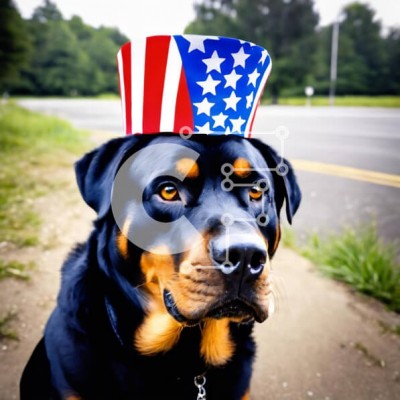Υπάρχει δυνατότητα προσωποποίησης με δική σας φωτογραφία και προσαρμογής διαστάσεων κατόπιν παραγγελίας. Το συγεκεριμενο Puzzle 10x10 cm – 25 κομμ παρουσιαζει Αυτή η εικόνα παρουσιάζει έναν μαύρο και καφέ σκύλο Ροτβάιλερ που φορά ένα καπέλο σε σχήμα αμερικανικής σημαίας. Ο σκύλος στέκεται στην άκρη του δρόμου με το κεφάλι γερμένο προς την κάμερα, φαίνεται να απολαμβάνει τη μέρα και να περιμένει το