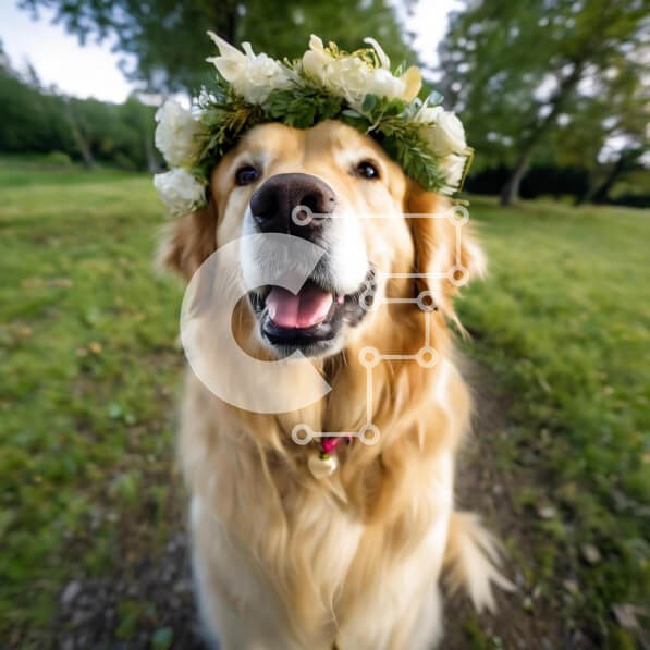 Υπάρχει δυνατότητα προσωποποίησης με δική σας φωτογραφία και προσαρμογής διαστάσεων κατόπιν παραγγελίας. Το συγεκεριμενο Puzzle 10x10 cm – 25 κομμ παρουσιαζει Αυτή η εικόνα παρουσιάζει ένα σκύλο Golden Retriever που φοράει μια διάταξη λουλουδιών στο κεφάλι του. Ο σκύλος χαμογελά και φαίνεται χαρούμενος καθώς κάθεται στο γρασίδι. Μπορεί να είναι το παιχνίδι με άλλα σκυλιά ή η ενασχόληση με κάποιο ε