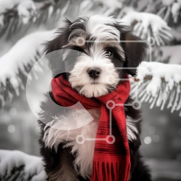 Υπάρχει δυνατότητα προσωποποίησης με δική σας φωτογραφία και προσαρμογής διαστάσεων κατόπιν παραγγελίας. Το συγεκεριμενο Puzzle 10x10 cm – 25 κομμ παρουσιαζει Η εικόνα απεικονίζει ένα αξιολάτρευτο κουτάβι με ασπρόμαυρη γούνα, που φορά ένα έντονο κόκκινο φουλάρι. Βρίσκεται σε ένα χιονισμένο φόντο με αειθαλή κλαδιά σκονισμένα στο χιόνι. Τα εκφραστικά μάτια και το χνουδωτό τρίχωμα του κουταβιού απαθα