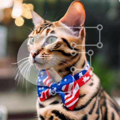 Υπάρχει δυνατότητα προσωποποίησης με δική σας φωτογραφία και προσαρμογής διαστάσεων κατόπιν παραγγελίας. Το συγεκεριμενο Puzzle 10x10 cm – 25 κομμ παρουσιαζει Η εικόνα απεικονίζει μια γάτα της Βεγγάλης που φορά ένα παπιγιόν με θέμα την αμερικανική σημαία. Η γάτα κάθεται έξω, με το κεφάλι της γερμένο στο πλάι και τα μάτια στραμμένα στην κάμερα. Φαίνεται να κοιτάζει κάτι στο προσκήνιο, το οποίο μπορ