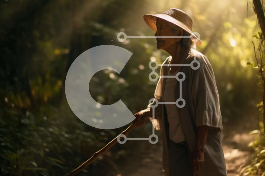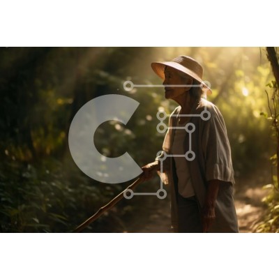 Υπάρχει δυνατότητα προσωποποίησης με δική σας φωτογραφία και προσαρμογής διαστάσεων κατόπιν παραγγελίας. Το συγεκεριμενο puzzle παρουσιαζει Αυτή η εικόνα δείχνει μια ηλικιωμένη γυναίκα να φορά ένα ψάθινο καπέλο και να κρατά ένα μπαστούνι, να περπατά σε ένα χωματόδρομο σε ένα καταπράσινο δάσος. Ο ήλιος λάμπει μέσα από τα δέντρα δημιουργώντας φωτεινό φως και σκιές στη γυναίκα και στο έδαφος. Περπατά με σκοπό, με τα