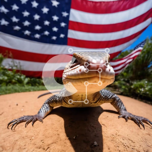 Υπάρχει δυνατότητα προσωποποίησης με δική σας φωτογραφία και προσαρμογής διαστάσεων κατόπιν παραγγελίας. Το συγεκεριμενο Puzzle 10x10 cm – 25 κομμ παρουσιαζει Η εικόνα δείχνει μια μεγάλη σαύρα να στέκεται μπροστά από μια αμερικανική σημαία. Φαίνεται να είναι στραμμένο προς την κάμερα, με το κεφάλι του γερμένο προς το έδαφος και τα μάτια ορθάνοιχτα. Υπάρχουν πολλά άλλα αντικείμενα στην εικόνα, όπως