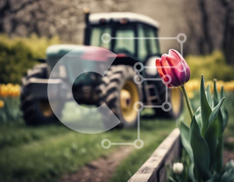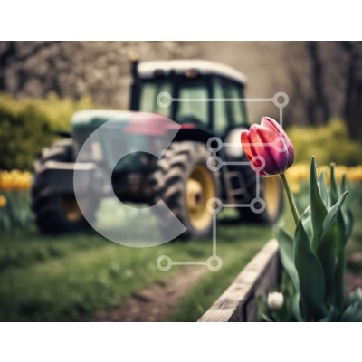 Υπάρχει δυνατότητα προσωποποίησης με δική σας φωτογραφία και προσαρμογής διαστάσεων κατόπιν παραγγελίας. Το συγεκεριμενο puzzle παρουσιαζει Αυτή η εικόνα δείχνει ένα κόκκινο λουλούδι τουλίπας στο πρώτο πλάνο, με φόντο ένα πράσινο χωράφι και ένα πορτοκαλί τρακτέρ. Το γεωργικό περιβάλλον υποδηλώνει την παρουσία αγροτικού εξοπλισμού, που ενδεχομένως περιλαμβάνει χορτοδετικές μηχανές ή θεριζοαλωνιστικές μηχανές. Ένα