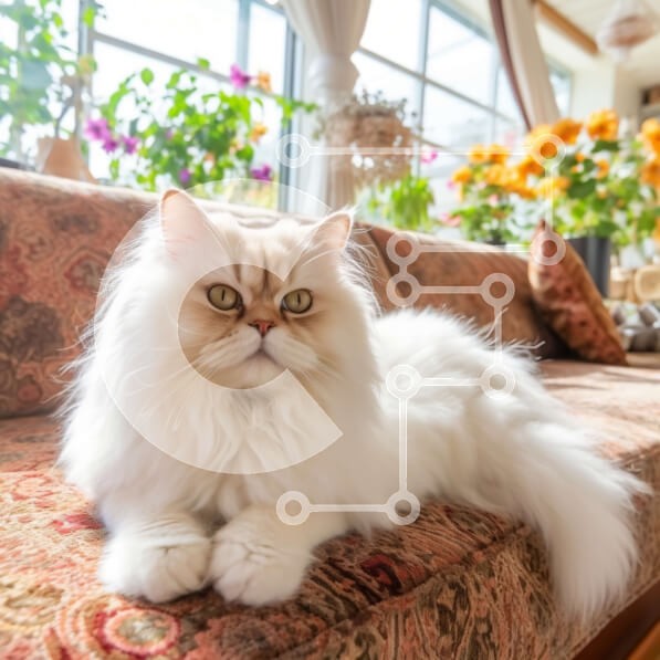 Υπάρχει δυνατότητα προσωποποίησης με δική σας φωτογραφία και προσαρμογής διαστάσεων κατόπιν παραγγελίας. Το συγεκεριμενο Puzzle 10x10 cm – 25 κομμ παρουσιαζει Αυτή η εικόνα παρουσιάζει μια αφράτη λευκή γάτα που κάθεται σε έναν καναπέ σε ένα σαλόνι με λουλούδια στο φόντο. Η γάτα κάθεται με τα πόδια της σφιγμένα κάτω από το σώμα της και τα μάτια της είναι ανοιχτά και σε εγρήγορση. Το σαλόνι είναι κα