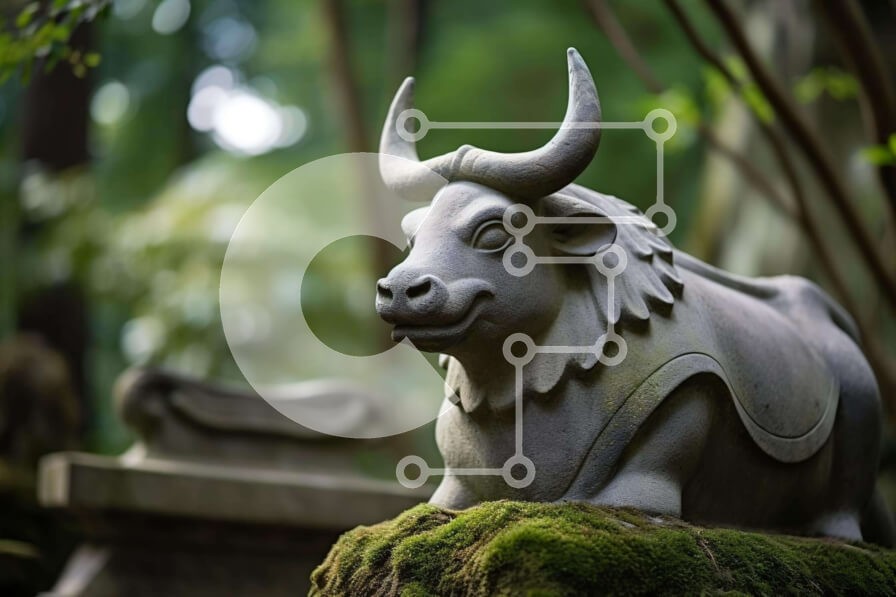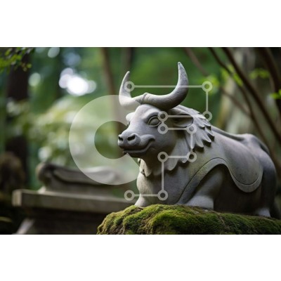 Υπάρχει δυνατότητα προσωποποίησης με δική σας φωτογραφία και προσαρμογής διαστάσεων κατόπιν παραγγελίας. Το συγεκεριμενο puzzle παρουσιαζει Η εικόνα απεικονίζει ένα άγαλμα ενός ασιατικού ταύρου, το οποίο είναι τοποθετημένο πάνω από βράχους καλυμμένους με βρύα. Το άγαλμα φαίνεται να είναι κατασκευασμένο από πέτρα και μπορεί να έχει δημιουργηθεί στην Ιαπωνία ή την Κίνα. Υπάρχουν πολλά δέντρα γύρω από το άγαλμα, υποδ