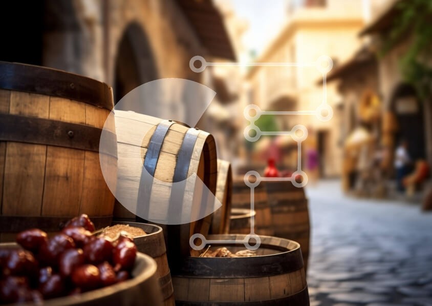 Υπάρχει δυνατότητα προσωποποίησης με δική σας φωτογραφία και προσαρμογής διαστάσεων κατόπιν παραγγελίας. Το συγεκεριμενο puzzle παρουσιαζει Η εικόνα παρουσιάζει ξύλινα βαρέλια στοιβαγμένα σε ένα λιθόστρωτο δρόμο, μερικά γεμάτα με φρούτα. Ένας κενός χώρος στο κέντρο είναι κατάλληλος για αποθήκευση ή έκθεση φρούτων. Τα φρέσκα σταφύλια υποδηλώνουν πρόσφατη συγκομιδή. Ένα μοναδικό puzzle που συνδυάζει ποιότητα, αισθη