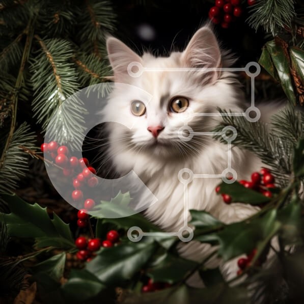 Υπάρχει δυνατότητα προσωποποίησης με δική σας φωτογραφία και προσαρμογής διαστάσεων κατόπιν παραγγελίας. Το συγεκεριμενο Puzzle 10x10 cm – 25 κομμ παρουσιαζει Η εικόνα απεικονίζει μια αφράτη λευκή γάτα με εντυπωσιακά χρυσά μάτια, φωλιασμένη ανάμεσα σε γιορτινό πράσινο φύλλωμα και κόκκινα μούρα. Η γάτα εμφανίζεται περίεργη και σε εγρήγορση, πλαισιωμένη από κλαδιά πεύκου και φύλλα πουρνάρι, δημιουργ