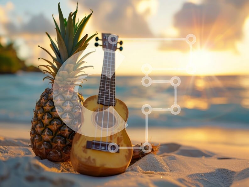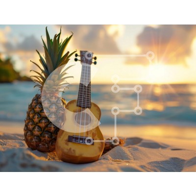 Υπάρχει δυνατότητα προσωποποίησης με δική σας φωτογραφία και προσαρμογής διαστάσεων κατόπιν παραγγελίας. Το συγεκεριμενο puzzle παρουσιαζει Αυτή η εικόνα παρουσιάζει ένα γιουκαλίλι και έναν ανανά να ξεκουράζονται σε μια αμμώδη παραλία, με φόντο τον ωκεανό και το ηλιοβασίλεμα. Το ζεστό χρυσό φως από τον ήλιο που δύει δημιουργεί μια όμορφη ατμόσφαιρα καθώς αντανακλάται από το νερό. Ο ανανάς στέκεται ψηλά δίπλα στο γ