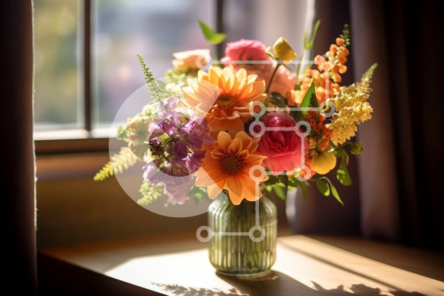 Υπάρχει δυνατότητα προσωποποίησης με δική σας φωτογραφία και προσαρμογής διαστάσεων κατόπιν παραγγελίας. Το συγεκεριμενο puzzle παρουσιαζει Αυτή η εικόνα παρουσιάζει ένα βάζο με πολύχρωμα λουλούδια που κάθεται σε ένα περβάζι με το φως του ήλιου να λάμπει μέσα από τα στόρια. Τα χρώματα των λουλουδιών είναι ζωντανά και εντυπωσιακά στο λευκό φόντο του περβάζι. Το φυσικό φως προσθέτει ζεστασιά και βάθος στην εικόνα, δ