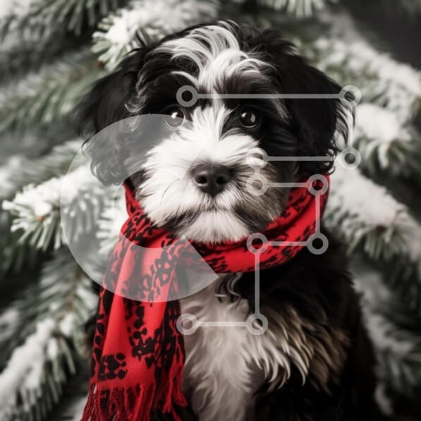 Υπάρχει δυνατότητα προσωποποίησης με δική σας φωτογραφία και προσαρμογής διαστάσεων κατόπιν παραγγελίας. Το συγεκεριμενο Puzzle 10x10 cm – 25 κομμ παρουσιαζει Η εικόνα απεικονίζει έναν αξιολάτρευτο σκύλο με ασπρόμαυρο παλτό, που κάθεται μπροστά σε ένα πεύκο που έχει σκονιστεί από το χιόνι. Ο σκύλος φοράει ένα έντονο κόκκινο φουλάρι, προσθέτοντας μια εορταστική πινελιά στο χειμερινό σκηνικό. Τα εκφ