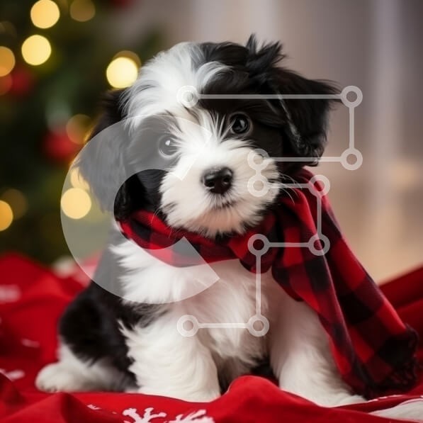 Υπάρχει δυνατότητα προσωποποίησης με δική σας φωτογραφία και προσαρμογής διαστάσεων κατόπιν παραγγελίας. Το συγεκεριμενο Puzzle 10x10 cm – 25 κομμ παρουσιαζει Η εικόνα απεικονίζει ένα αξιολάτρευτο ασπρόμαυρο κουτάβι που κάθεται σε μια κόκκινη κουβέρτα με εορταστικά στολίδια στο φόντο. Το κουτάβι φοράει ένα κόκκινο και μαύρο καρό μαντήλι και τα μεγάλα μάτια του δίνουν μια αθώα και παιχνιδιάρικη έκφ