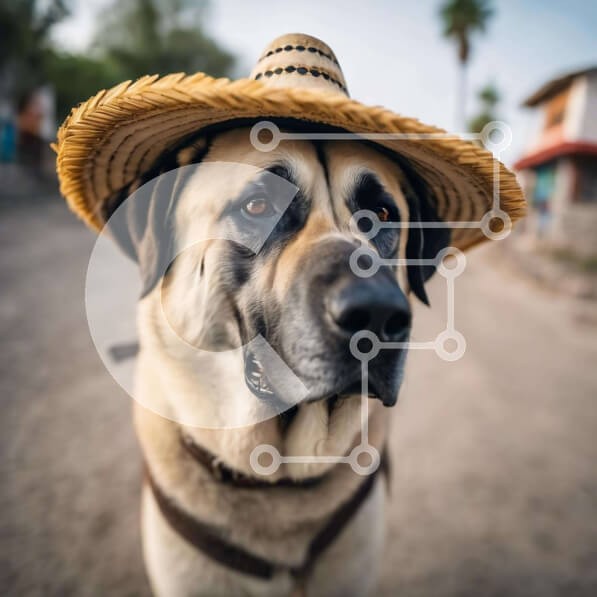 Υπάρχει δυνατότητα προσωποποίησης με δική σας φωτογραφία και προσαρμογής διαστάσεων κατόπιν παραγγελίας. Το συγεκεριμενο Puzzle 10x10 cm – 25 κομμ παρουσιαζει Αυτή η εικόνα παρουσιάζει έναν μεγάλο, καφέ σκύλο που φοράει ένα ψάθινο καπέλο με αυθεντική εμφάνιση. Ο σκύλος στέκεται στο έδαφος και κοιτάζει την κάμερα με το κεφάλι γερμένο στο πλάι. Φαίνεται να είναι χαλαρό και άνετο, κάτι που μπορεί να