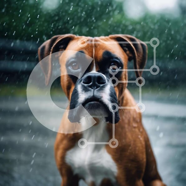 Υπάρχει δυνατότητα προσωποποίησης με δική σας φωτογραφία και προσαρμογής διαστάσεων κατόπιν παραγγελίας. Το συγεκεριμενο Puzzle 10x10 cm – 25 κομμ παρουσιαζει Η εικόνα δείχνει έναν καφέ και λευκό σκύλο μπόξερ να κάθεται στο έδαφος κάτω από τη βροχή, κοιτάζοντας προσεκτικά την κάμερα. Η έκφραση του σκύλου υποδηλώνει περιέργεια και προσμονή, πιθανώς να περιμένει τον ιδιοκτήτη του. Το βροχερό σκηνικό