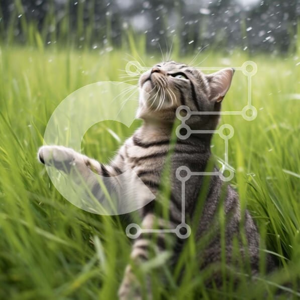 Υπάρχει δυνατότητα προσωποποίησης με δική σας φωτογραφία και προσαρμογής διαστάσεων κατόπιν παραγγελίας. Το συγεκεριμενο Puzzle 10x10 cm – 25 κομμ παρουσιαζει Η εικόνα δείχνει μια γάτα να κάθεται στο γρασίδι και να κοιτάζει τον ουρανό. Φαίνεται να απολαμβάνει τον βροχερό καιρό σε εξωτερικούς χώρους και μπορεί να αλληλεπιδρά με ένα άλλο ζώο όπως μια κουκουβάγια ή πουλί σκαρφαλωμένο πάνω από το ψηλό