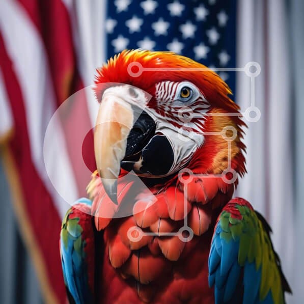 Υπάρχει δυνατότητα προσωποποίησης με δική σας φωτογραφία και προσαρμογής διαστάσεων κατόπιν παραγγελίας. Το συγεκεριμενο Puzzle 10x10 cm – 25 κομμ παρουσιαζει Η εικόνα δείχνει έναν πολύχρωμο παπαγάλο να στέκεται μπροστά από μια αμερικανική σημαία. Το κεφάλι του πουλιού γέρνει ελαφρά στο πλάι, υποδηλώνοντας ότι είναι σκαρφαλωμένο στην κορυφή της σημαίας και κοιτάζει την κάμερα. Φαίνεται επίσης να κ