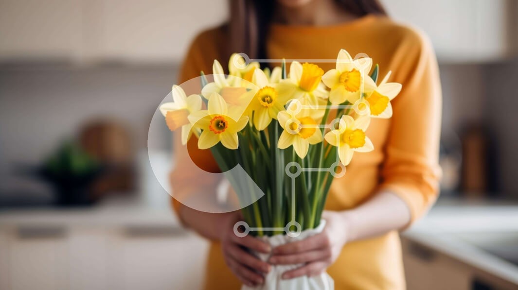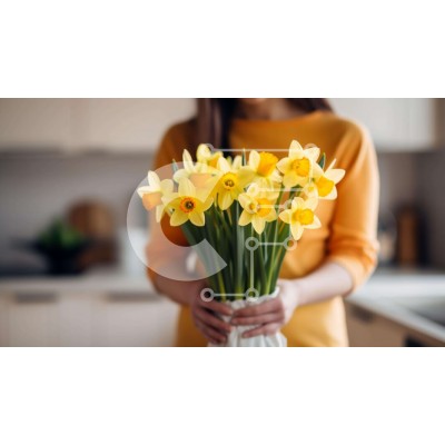 Υπάρχει δυνατότητα προσωποποίησης με δική σας φωτογραφία και προσαρμογής διαστάσεων κατόπιν παραγγελίας. Το συγεκεριμενο puzzle παρουσιαζει Αυτή η εικόνα παρουσιάζει μια γυναίκα που κρατά ένα μπουκέτο από φρέσκους και ζωντανούς κίτρινους νάρκισσους. Τα λουλούδια είναι το επίκεντρο της προσοχής και υπάρχουν μικρές γλάστρες στο τραπέζι δίπλα της, που υποδηλώνουν προετοιμασίες για δείπνο ή διασκέδαση. Ένα μοναδικό p