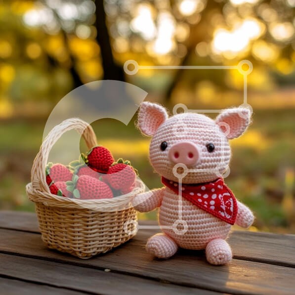 Υπάρχει δυνατότητα προσωποποίησης με δική σας φωτογραφία και προσαρμογής διαστάσεων κατόπιν παραγγελίας. Το συγεκεριμενο Puzzle 10x10 cm – 25 κομμ παρουσιαζει Αυτή η εικόνα παρουσιάζει ένα χαριτωμένο κροσέ παιχνίδι γουρουνιού που κάθεται σε ένα ξύλινο τραπέζι δίπλα σε ένα καλάθι γεμάτο με κόκκινες φράουλες. Το φόντο είναι μια απαλή εστίαση από πράσινα δέντρα που φωτίζονται από το ζεστό φως του ήλι