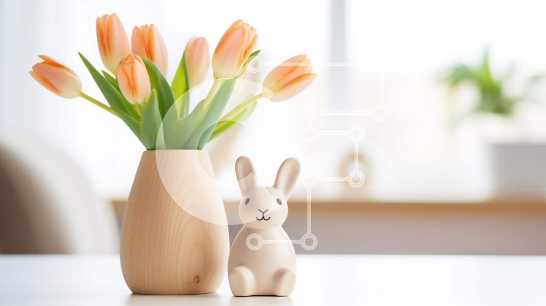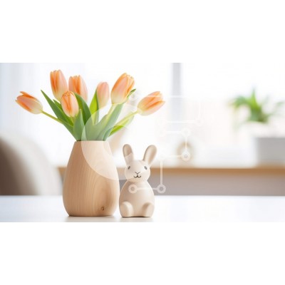 Υπάρχει δυνατότητα προσωποποίησης με δική σας φωτογραφία και προσαρμογής διαστάσεων κατόπιν παραγγελίας. Το συγεκεριμενο puzzle παρουσιαζει Αυτή η εικόνα παρουσιάζει ένα ξύλινο ειδώλιο κουνελιού που κάθεται δίπλα σε δύο πορτοκαλί τουλίπες σε ένα βάζο. Ένα άδειο βάζο είναι επίσης ορατό στο τραπέζι, υποδηλώνοντας ότι τα λουλούδια μπορεί να έχουν ληφθεί από άλλο δωμάτιο. Επιπλέον, υπάρχει μια σύνθεση λουλουδιών, όπως