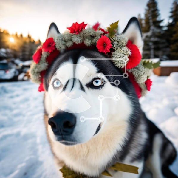 Υπάρχει δυνατότητα προσωποποίησης με δική σας φωτογραφία και προσαρμογής διαστάσεων κατόπιν παραγγελίας. Το συγεκεριμενο Puzzle 10x10 cm – 25 κομμ παρουσιαζει Η εικόνα δείχνει έναν ασπρόμαυρο σκύλο γεροδεμένο να κάθεται στο χιόνι με το κεφάλι του καλυμμένο με λουλούδια. Τα μάτια του σκύλου φαίνονται να είναι ορθάνοιχτα, υποδηλώνοντας ότι κοιτάζει κάτι ή κάποιον. Μπορεί επίσης να υπονοεί ότι ο σκύλ