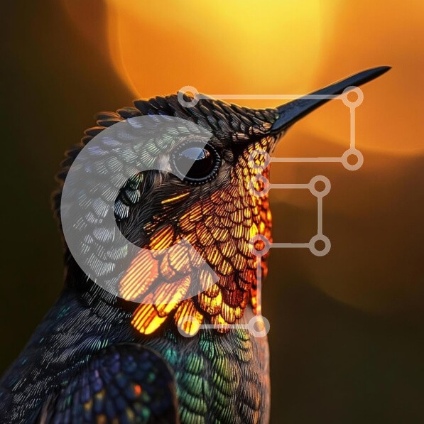 Υπάρχει δυνατότητα προσωποποίησης με δική σας φωτογραφία και προσαρμογής διαστάσεων κατόπιν παραγγελίας. Το συγεκεριμενο Puzzle 10x10 cm – 25 κομμ παρουσιαζει Αυτή η εικόνα παρουσιάζει ένα κοντινό πλάνο ενός κολιμπρί, που δείχνει το ζωντανό και ιριδίζον φτέρωμά του. Τα φτερά του πουλιού εμφανίζουν μια εκπληκτική σειρά χρωμάτων, ιδιαίτερα πορτοκαλί και πράσινο, που φωτίζονται από το ζεστό φως του ή