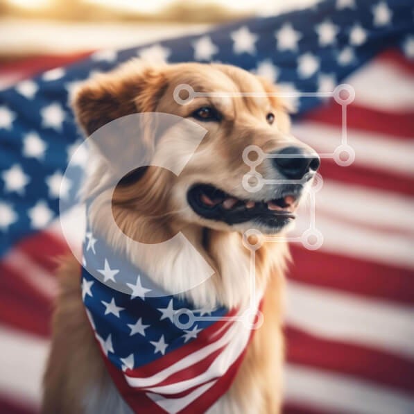 Υπάρχει δυνατότητα προσωποποίησης με δική σας φωτογραφία και προσαρμογής διαστάσεων κατόπιν παραγγελίας. Το συγεκεριμενο Puzzle 10x10 cm – 25 κομμ παρουσιαζει Η εικόνα δείχνει ένα σκυλί Golden Retriever στολισμένο με μια μπαντάνα με αμερικανική σημαία, που στέκεται περήφανα μπροστά από την αμερικανική σημαία. Ο σκύλος κοιτάζει κατευθείαν την κάμερα με μια χαρούμενη έκφραση, μεταφέροντας ευτυχία κα