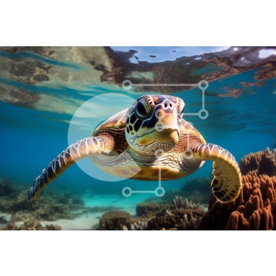 Υπάρχει δυνατότητα προσωποποίησης με δική σας φωτογραφία και προσαρμογής διαστάσεων κατόπιν παραγγελίας. Το συγεκεριμενο puzzle παρουσιαζει Αυτή η εικόνα δείχνει μια πράσινη θαλάσσια χελώνα που κολυμπά σε καταγάλανα νερά με εντυπωσιακούς πολύχρωμους κοραλλιογενείς υφάλους που χρησιμεύουν ως ένα γραφικό σκηνικό. Η χελώνα έχει καφέ κέλυφος και βατραχοπέδιλα, μακρύ λαιμό και στρογγυλό σώμα με μικρό κεφάλι. Τα μάτια τ