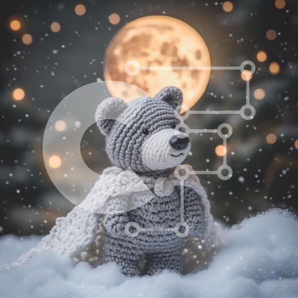Υπάρχει δυνατότητα προσωποποίησης με δική σας φωτογραφία και προσαρμογής διαστάσεων κατόπιν παραγγελίας. Το συγεκεριμενο Puzzle 10x10 cm – 25 κομμ παρουσιαζει Αυτή η εικόνα παρουσιάζει μια χαριτωμένη αρκούδα με κροσέ που στέκεται σε ένα χιονισμένο τοπίο. Η αρκούδα, φτιαγμένη από γκρι νήμα, φοράει μια λευκή κάπα και έχει μια γοητευτική έκφραση στο πρόσωπό της. Πίσω από την αρκούδα, μια μεγάλη πανσέ