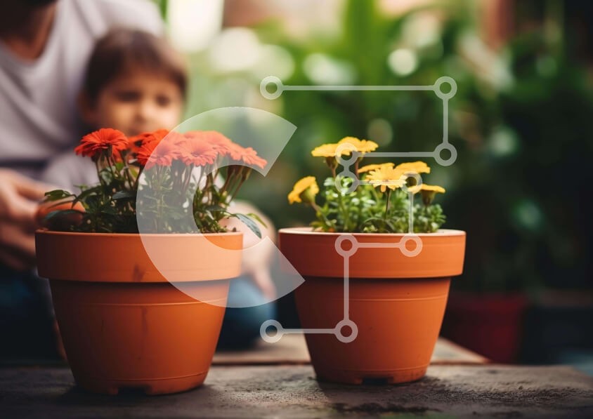 Υπάρχει δυνατότητα προσωποποίησης με δική σας φωτογραφία και προσαρμογής διαστάσεων κατόπιν παραγγελίας. Το συγεκεριμενο puzzle παρουσιαζει Η εικόνα παρουσιάζει δύο λουλούδια σε γλάστρες, το ένα εκ των οποίων είναι πορτοκαλί χρώματος. Ένα μικρό παιδί κάθεται σε ένα ξύλινο τραπέζι δίπλα στις γλάστρες και φαίνεται να κοιτάζει τα λουλούδια με ενδιαφέρον. Υπάρχουν επίσης κάποια άλλα φυτά που υπάρχουν στη σκηνή, όπως φ