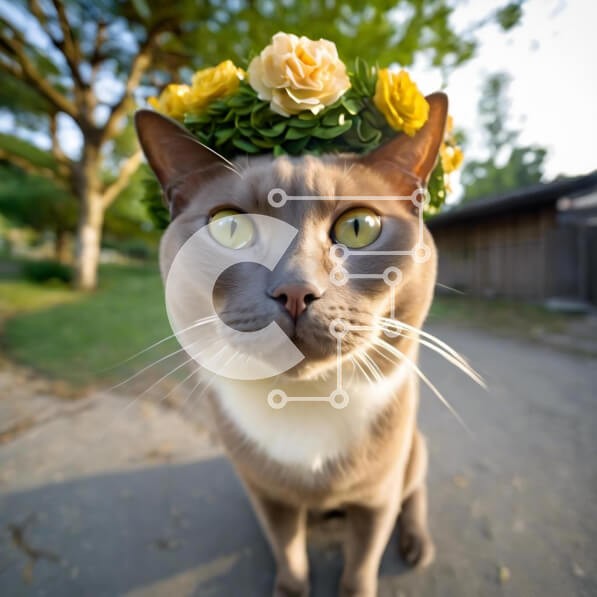 Υπάρχει δυνατότητα προσωποποίησης με δική σας φωτογραφία και προσαρμογής διαστάσεων κατόπιν παραγγελίας. Το συγεκεριμενο Puzzle 10x10 cm – 25 κομμ παρουσιαζει Αυτή η εικόνα παρουσιάζει μια γκρίζα γάτα που φορά μια διάταξη από λουλούδια στο κεφάλι της. Η γάτα στέκεται στη μέση του δρόμου, κοιτώντας μακριά από την κάμερα, με γουρλωμένα και λαμπερά μάτια που υποδηλώνουν ότι κοιτάζει κατευθείαν τον θε