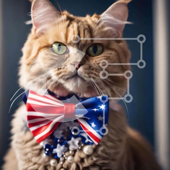 Υπάρχει δυνατότητα προσωποποίησης με δική σας φωτογραφία και προσαρμογής διαστάσεων κατόπιν παραγγελίας. Το συγεκεριμενο Puzzle 10x10 cm – 25 κομμ παρουσιαζει Η εικόνα απεικονίζει μια γάτα που φορά ένα παπιγιόν με θέμα την αμερικανική σημαία. Η γάτα κάθεται στη μέση του δωματίου, με το κεφάλι της να γέρνει ελαφρά στο πλάι. Φαίνεται να κοιτάζει απευθείας την κάμερα, η οποία φαίνεται από το παράθυρο