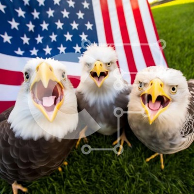 Υπάρχει δυνατότητα προσωποποίησης με δική σας φωτογραφία και προσαρμογής διαστάσεων κατόπιν παραγγελίας. Το συγεκεριμενο Puzzle 10x10 cm – 25 κομμ παρουσιαζει Η εικόνα παρουσιάζει τρεις φαλακρούς αετούς να στέκονται μπροστά από μια αμερικανική σημαία, με το στόμα ανοιχτό και το ράμφος τους. Αυτά τα πουλιά είναι πιθανότατα μέρος ενός κοπαδιού που συγκεντρώνεται στο γρασίδι για να γιορτάσει πατριωτι
