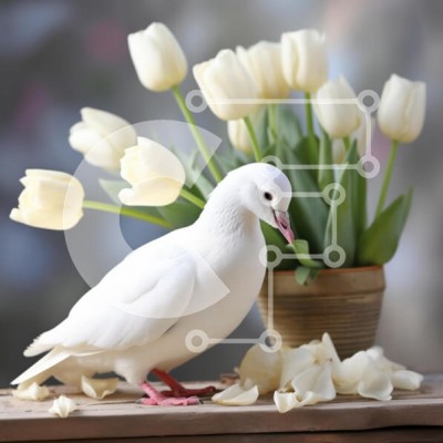 Υπάρχει δυνατότητα προσωποποίησης με δική σας φωτογραφία και προσαρμογής διαστάσεων κατόπιν παραγγελίας. Το συγεκεριμενο Puzzle 10x10 cm – 25 κομμ παρουσιαζει Η εικόνα δείχνει ένα λευκό περιστέρι να στέκεται με χάρη δίπλα σε μια γλάστρα με ανθισμένες λευκές τουλίπες. Το περιστέρι, με τα λεία φτερά και την απαλή του συμπεριφορά, περιβάλλεται από πεσμένα πέταλα λουλουδιών σε μια ξύλινη επιφάνεια. Το