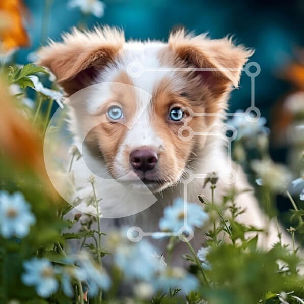 Υπάρχει δυνατότητα προσωποποίησης με δική σας φωτογραφία και προσαρμογής διαστάσεων κατόπιν παραγγελίας. Το συγεκεριμενο Puzzle 10x10 cm – 25 κομμ παρουσιαζει Αυτή η εικόνα παρουσιάζει ένα καφέ και άσπρο κουτάβι με μπλε μάτια που κάθεται ανάμεσα σε μπλε και λευκά λουλούδια σε έναν κήπο. Το κουτάβι έχει μια χνουδωτή ουρά και κοιτάζει απευθείας την κάμερα με μια περίεργη έκφραση. Τα λουλούδια στο βά