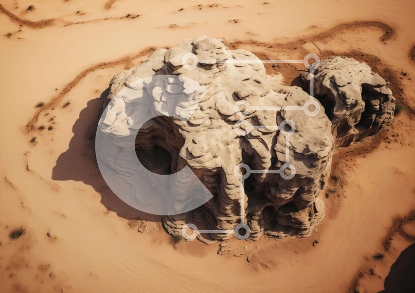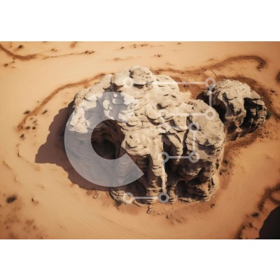 Υπάρχει δυνατότητα προσωποποίησης με δική σας φωτογραφία και προσαρμογής διαστάσεων κατόπιν παραγγελίας. Το συγεκεριμενο puzzle παρουσιαζει Αυτή η εικόνα παρουσιάζει μια εναέρια άποψη ενός μεγάλου σχηματισμού βράχου στην έρημο. Αρκετοί βράχοι είναι διάσπαρτοι στην περιοχή, με έναν να φαίνεται ψηλότερος από τους άλλους. Ένα άτομο μπορεί να δει να στέκεται στην κορυφή ενός από τους βράχους, κοιτάζοντας προς τα κάτω