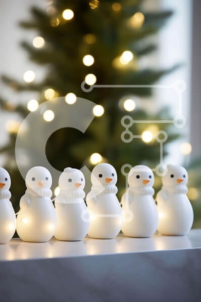 Υπάρχει δυνατότητα προσωποποίησης με δική σας φωτογραφία και προσαρμογής διαστάσεων κατόπιν παραγγελίας. Το συγεκεριμενο Puzzle 10x10 cm – 25 κομμ παρουσιαζει Αυτή η εικόνα παρουσιάζει μια σειρά από λευκά ειδώλια χιονάνθρωπους τοποθετημένα μπροστά από ένα φωτισμένο χριστουγεννιάτικο δέντρο. Ο μανδύας είναι στολισμένος με κόκκινα και πράσινα γιορτινά φώτα, δημιουργώντας μια εορταστική ατμόσφαιρα. Κ