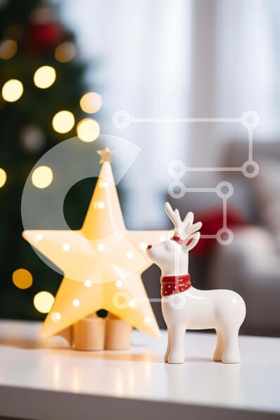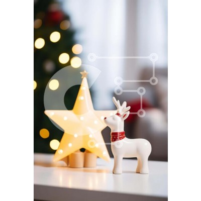 Υπάρχει δυνατότητα προσωποποίησης με δική σας φωτογραφία και προσαρμογής διαστάσεων κατόπιν παραγγελίας. Το συγεκεριμενο Puzzle 10x10 cm – 25 κομμ παρουσιαζει Αυτή η εικόνα παρουσιάζει ένα ειδώλιο λευκού ταράνδου τοποθετημένο πάνω από ένα διακοσμημένο τραπέζι σε σχήμα αστεριού σε ένα άνετο σαλόνι. Το τραπέζι είναι στολισμένο με πολλά φωτάκια, δημιουργώντας μια γιορτινή ατμόσφαιρα. Μέσα από το παρά
