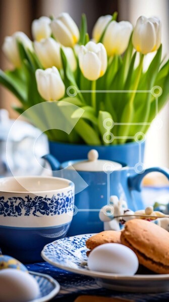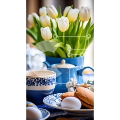 Υπάρχει δυνατότητα προσωποποίησης με δική σας φωτογραφία και προσαρμογής διαστάσεων κατόπιν παραγγελίας. Το συγεκεριμενο Puzzle 10x10 cm – 25 κομμ παρουσιαζει Η εικόνα παρουσιάζει ένα απολαυστικό τραπέζι με θέμα το Πάσχα με μπλε και λευκή διακόσμηση. Το τραπέζι είναι στολισμένο με πιάτα, μπολ, φλιτζάνια και μπισκότα, μαζί με όμορφες τουλίπες τοποθετημένες στο κέντρο. Επιπλέον, δύο μικρές γλάστρες