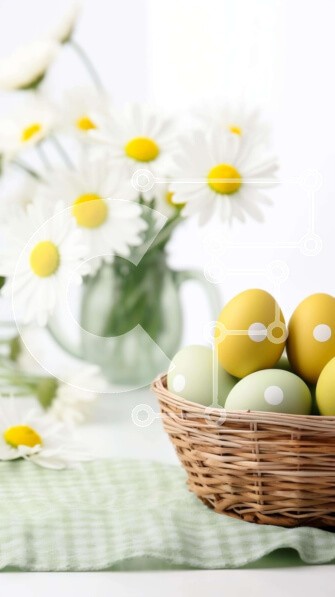Υπάρχει δυνατότητα προσωποποίησης με δική σας φωτογραφία και προσαρμογής διαστάσεων κατόπιν παραγγελίας. Το συγεκεριμενο Puzzle 10x10 cm – 25 κομμ παρουσιαζει Αυτή η εικόνα παρουσιάζει ένα ψάθινο καλάθι γεμάτο με πολύχρωμα πασχαλινά αυγά και μαργαρίτες, τοποθετημένο σε ένα τραπέζι. Γύρω από το καλάθι υπάρχουν πολλά λευκά λουλούδια, που προσθέτουν στην εορταστική διάταξη. Υπάρχει επίσης ένα κοντινό