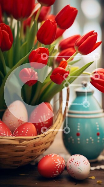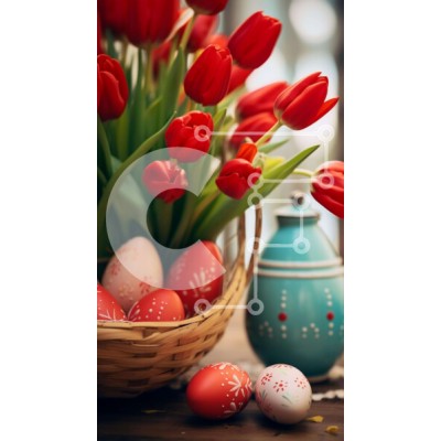 Υπάρχει δυνατότητα προσωποποίησης με δική σας φωτογραφία και προσαρμογής διαστάσεων κατόπιν παραγγελίας. Το συγεκεριμενο Puzzle 10x10 cm – 25 κομμ παρουσιαζει Αυτή η εικόνα παρουσιάζει μια εορταστική πασχαλινή επίδειξη με ένα καλάθι γεμάτο με κόκκινες τουλίπες, πασχαλινά αυγά και διάφορα διακοσμητικά αντικείμενα. Ένα βάζο σε σχήμα αυγού είναι επίσης ορατό στο τραπέζι, δίπλα σε πολλά μικρά αγγεία π
