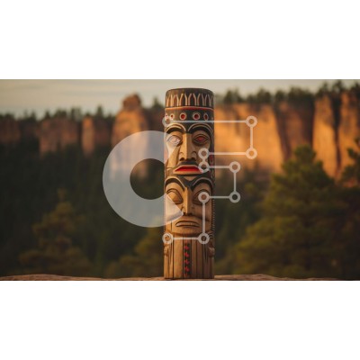 Υπάρχει δυνατότητα προσωποποίησης με δική σας φωτογραφία και προσαρμογής διαστάσεων κατόπιν παραγγελίας. Το συγεκεριμενο puzzle παρουσιαζει Αυτή η εικόνα παρουσιάζει ένα παραδοσιακό κοντάρι τοτέμ από ξύλο και στολισμένο με ένα ιθαγενές πρόσωπο. Τοποθετείται στην κορυφή βράχων στο πρώτο πλάνο, υποδηλώνοντας σκόπιμη τοποθέτηση. Το φόντο παρουσιάζει πολλά δέντρα, υπονοώντας την παρουσία φυσικού τοπίου. Ένα μοναδικό