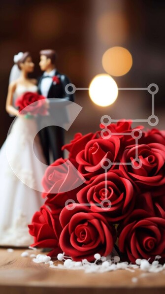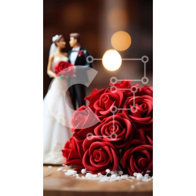 Υπάρχει δυνατότητα προσωποποίησης με δική σας φωτογραφία και προσαρμογής διαστάσεων κατόπιν παραγγελίας. Το συγεκεριμενο Puzzle 10x10 cm – 25 κομμ παρουσιαζει Η εικόνα δείχνει ένα ειδώλιο νύφης και γαμπρού μαζί με ένα μπουκέτο με κόκκινα τριαντάφυλλα. Γύρω από την επιφάνεια εργασίας υπάρχουν μικροί κρύσταλλοι που προσθέτουν μια πινελιά κομψότητας και γοητείας στη σκηνή. Ένα μοναδικό Puzzle 10x10