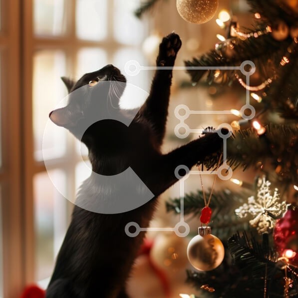 Υπάρχει δυνατότητα προσωποποίησης με δική σας φωτογραφία και προσαρμογής διαστάσεων κατόπιν παραγγελίας. Το συγεκεριμενο Puzzle 10x10 cm – 25 κομμ παρουσιαζει Αυτή η εικόνα παρουσιάζει μια παιχνιδιάρικη μαύρη γάτα που φτάνει για ένα χρυσό στολίδι σε ένα όμορφα στολισμένο χριστουγεννιάτικο δέντρο. Η γούνα της γάτας λάμπει στο ζεστό φως και περιβάλλεται από φώτα που αναβοσβήνουν και εορταστικές διακ