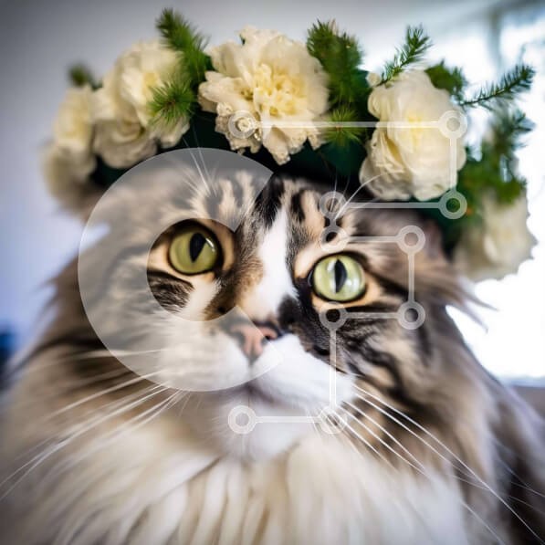 Υπάρχει δυνατότητα προσωποποίησης με δική σας φωτογραφία και προσαρμογής διαστάσεων κατόπιν παραγγελίας. Το συγεκεριμενο Puzzle 10x10 cm – 25 κομμ παρουσιαζει Αυτή η εικόνα παρουσιάζει μια αξιολάτρευτη γάτα που φορά ένα στέμμα από λουλούδια. Η γάτα είτε κάθεται είτε είναι ξαπλωμένη, κοιτάζοντας απευθείας την κάμερα. Γύρω από το κεφάλι του υπάρχουν πολλά λευκά λουλούδια, που προσθέτουν στη γοητεία
