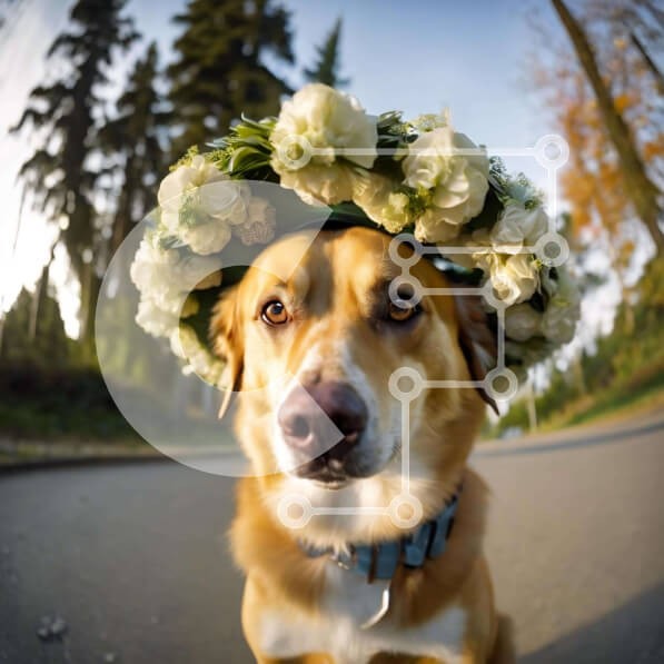 Υπάρχει δυνατότητα προσωποποίησης με δική σας φωτογραφία και προσαρμογής διαστάσεων κατόπιν παραγγελίας. Το συγεκεριμενο Puzzle 10x10 cm – 25 κομμ παρουσιαζει Η εικόνα απεικονίζει έναν καφέ σκύλο που φορά ένα στέμμα από διάφορα λουλούδια. Ο σκύλος κάθεται στη μέση του δρόμου, κοιτώντας μακριά από την κάμερα και παρατηρώντας το περιβάλλον του. Γύρω από το κεφάλι του σκύλου υπάρχουν τριαντάφυλλα, γα