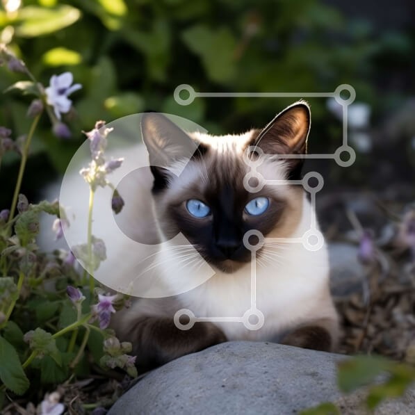 Υπάρχει δυνατότητα προσωποποίησης με δική σας φωτογραφία και προσαρμογής διαστάσεων κατόπιν παραγγελίας. Το συγεκεριμενο Puzzle 10x10 cm – 25 κομμ παρουσιαζει Αυτή η εικόνα παρουσιάζει μια καφέ και άσπρη γάτα με μπλε μάτια που κάθεται σε έναν βράχο σε έναν κήπο. Η γούνα της γάτας είναι αφράτη και τα μάτια της είναι έντονο μπλε, κοιτάζοντας απευθείας την κάμερα. Το φόντο είναι γεμάτο με πολύχρωμα λ