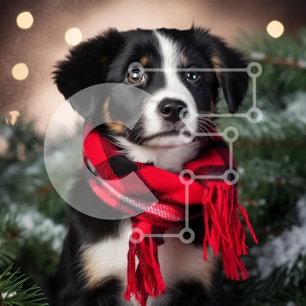Υπάρχει δυνατότητα προσωποποίησης με δική σας φωτογραφία και προσαρμογής διαστάσεων κατόπιν παραγγελίας. Το συγεκεριμενο Puzzle 10x10 cm – 25 κομμ παρουσιαζει Η εικόνα απεικονίζει ένα χαριτωμένο ασπρόμαυρο κουτάβι με εκφραστικά μάτια, που φορά ένα κόκκινο και μαύρο καρό κασκόλ. Το κουτάβι περιβάλλεται από κλαδιά πεύκου και απαλό χιόνι, με λαμπερά φώτα bokeh στο βάθος, δημιουργώντας μια ζεστή και γ