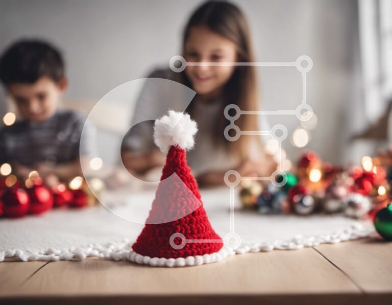 Υπάρχει δυνατότητα προσωποποίησης με δική σας φωτογραφία και προσαρμογής διαστάσεων κατόπιν παραγγελίας. Το συγεκεριμενο Puzzle 10x10 cm – 25 κομμ παρουσιαζει Αυτή η εικόνα απεικονίζει δύο παιδιά να κάθονται σε ένα τραπέζι φορώντας κροσέ καπέλα Άγιου Βασίλη. Περιβάλλονται από χριστουγεννιάτικα στολίδια, όπως δέντρα, στολίδια και κεριά. Τα παιδιά φαίνονται να παίζουν με κούκλες και να ασχολούνται μ