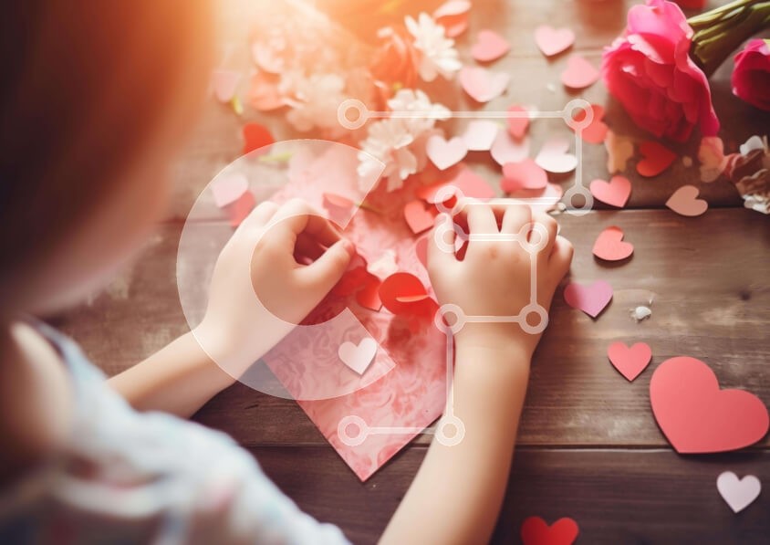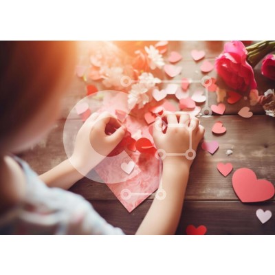 Υπάρχει δυνατότητα προσωποποίησης με δική σας φωτογραφία και προσαρμογής διαστάσεων κατόπιν παραγγελίας. Το συγεκεριμενο Puzzle 10x10 cm – 25 κομμ παρουσιαζει Η εικόνα δείχνει ένα νεαρό κορίτσι να φτιάχνει κάρτες για την Ημέρα του Αγίου Βαλεντίνου με χάρτινες καρδιές και λουλούδια. Το κορίτσι κάθεται στο ξύλινο τραπέζι, ασχολείται με μια βιοτεχνική δραστηριότητα ή μια δημιουργική διαδικασία. Κόκκι